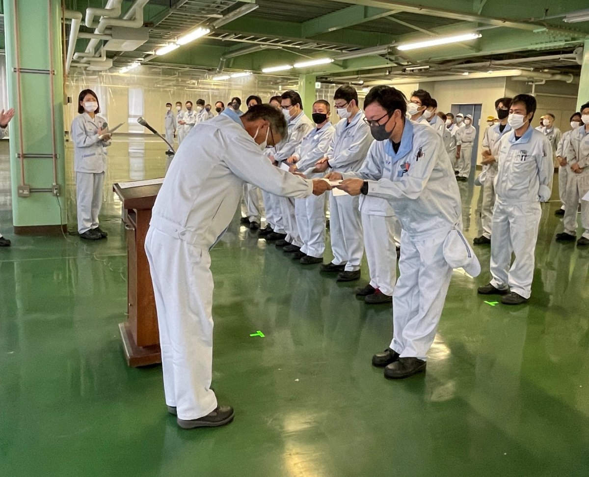2021年12月24日(金) 「永年勤続表彰式」ならびに「技能検定合格者表彰式」 11月22日、恒例行事の「永年勤続表彰式」ならびに「技能検定合格者表彰式」が行われました。 長年功績のあった従業員への表彰を行い、また国家資格である「技能検定」で今年も沢山の従業員が合格しました。