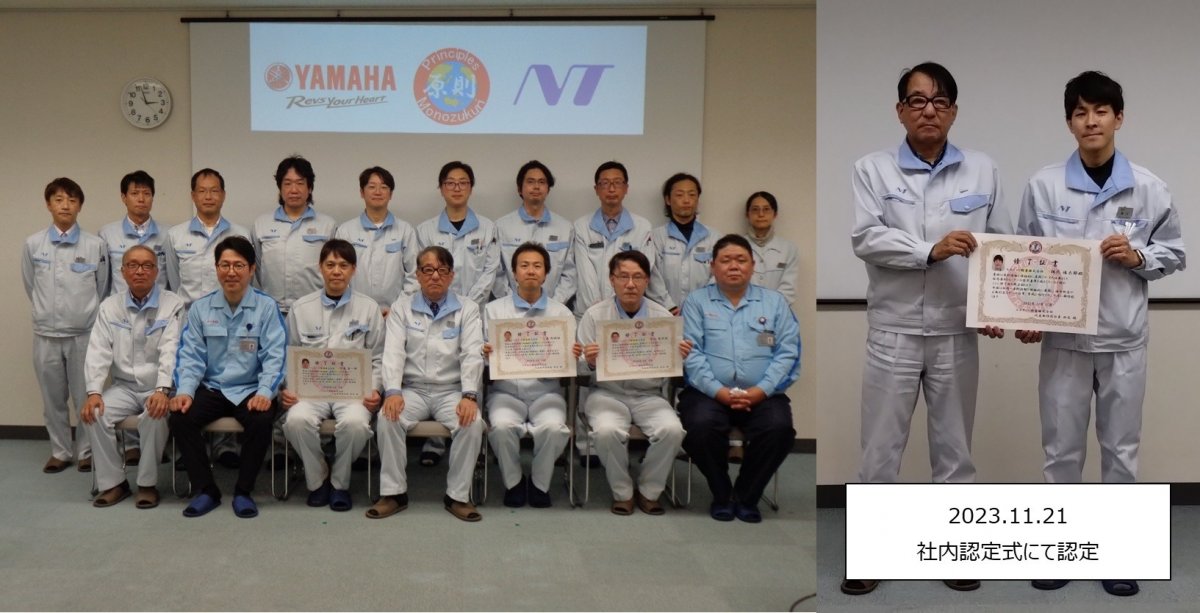 2024年02月29日(木) 社内原則トレーナー修了認定式 2023年度の原則トレーナー育成活動が終了し、2/14(水)にヤマハ発動機様をお迎えして社内で修了認定式を行いました。 新たに4名が原則トレーナーに認定され、トレーナー認定バッジと修了証書が授与されました。 今後トレーナーを中心に品質向上活動を進めます。