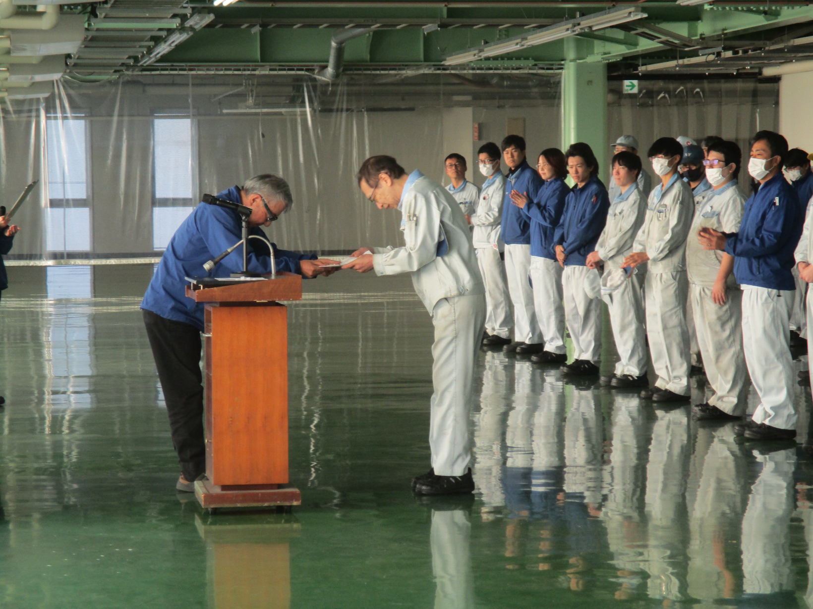 2025年11月24日(月) 2025年度「永年勤続表彰式」ならびに「各種検定合格者表彰式」 11月21日、恒例行事の「永年勤続表彰」ならびに「各種検定合格者表彰式」が行われました。 永年勤続では入社10年目から35年目の、計14名の方が表彰され、会場は温かい拍手に包まれました。 また「技能検定」「自主保全士検定」「品質管理検定」では合計8名の社員が見事合格し、表彰されました。